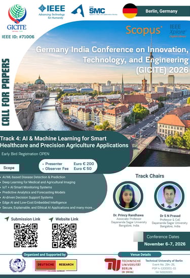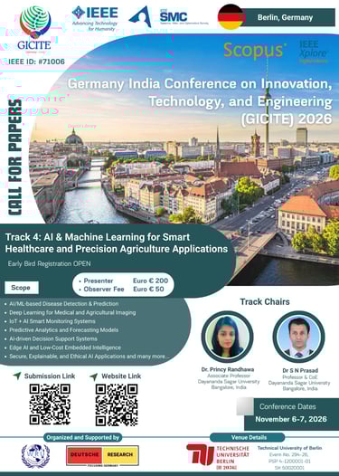 This special session focuses on emerging research in AI, Machine Learning, and Deep Learning for smart healthcare and precision agriculture applications. The session aims to highlight innovative solutions in disease prediction, medical/agricultural imaging, IoT-based monitoring, decision support systems, and ethical AI deployment.